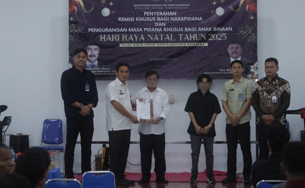 TARAKAN – 79 orang Narapidana (Napi) Lembaga Pemasyarakatan (Lapas) Kelas IIA Tarakan beragama Nasrani menerima Remisi Khusus (RK) atau pengurangan masa pidana berdasarkan Undang-Undang bertepatan dengan Hari Raya Natal Tahun 2025 yang diserahkan secara simbolis oleh Kepala Lapas (Kalapas), Jupri, bertempat di Gereja Oikumene, Kamis (25/12).