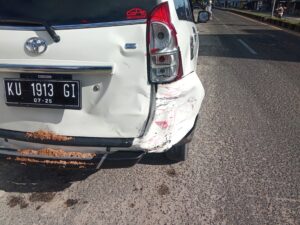 “Mobil saya parkir dan ditinggal kurang lebih 10 menit ke kantor yang ada di seberang jalan, tidak menyangka suara keras yang terdengar ternyata mobil saya yang ditabrak oleh pengendara motor. Dan padahal mobil juga dipasang rem tangan bergeser juga akibat kerasnya hantaman dari belakang”, ungkap Riansyah kepada warga dan Polisi saat di TKP.