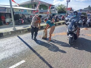 Sementara akibat tumpahan solar di tengah jalan, antisipasi jalanan licin, Polisi dibantu warga melakukan penyiraman pasir agar tidak mengakibatkan kecelakaan. (ml)