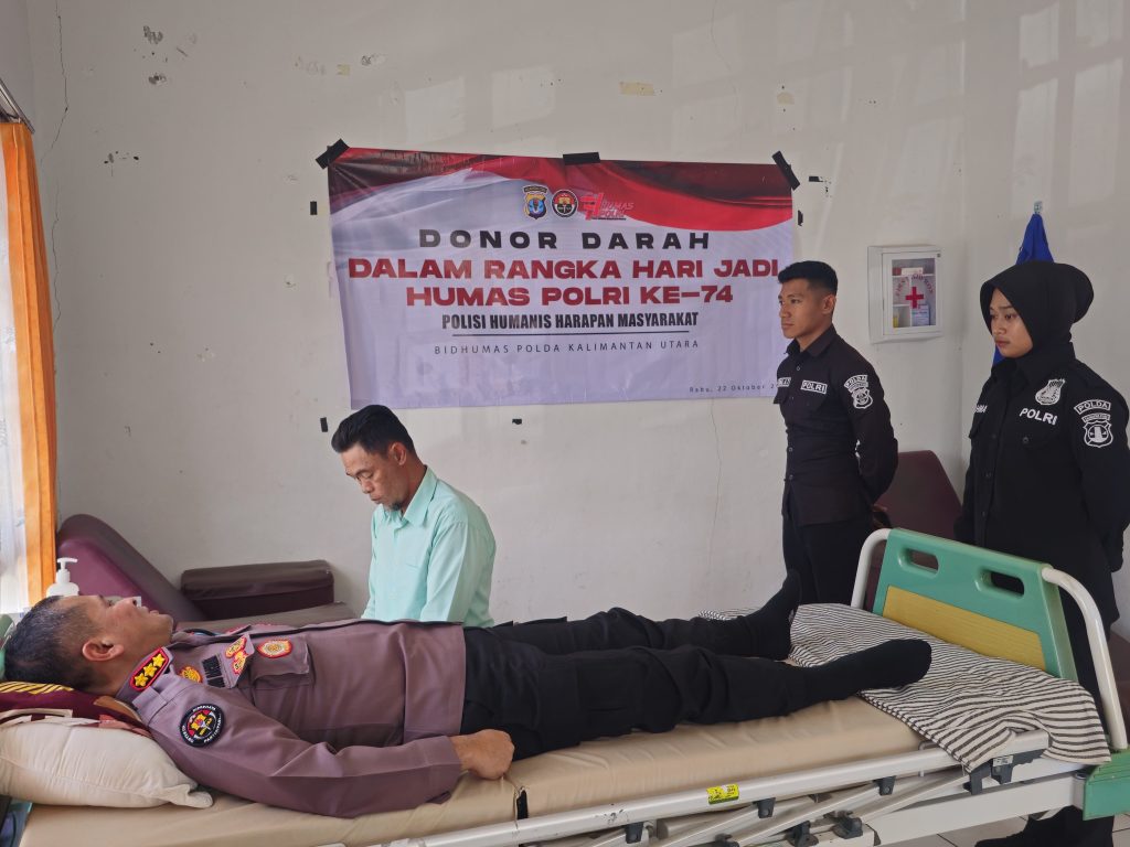 TANJUNG SELOR – Bidang Hubungan Masyarakat (Bidhumas) Kepolisian Daerah Kalimantan Utara (Polda Kaltara) melaksanakan kegiatan donor darah serentak sebagai bagian dari rangkaian peringatan Hari Ulang Tahun (HUT) Humas Polri yang ke-74.