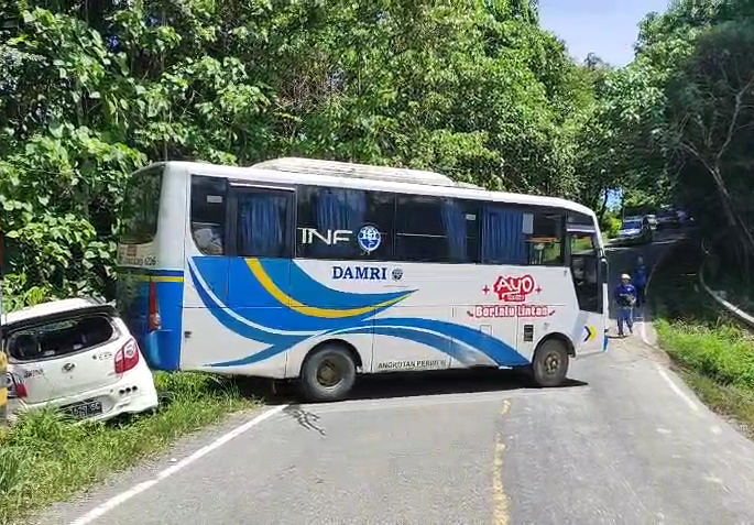Tali Gas Putus di Tanjakan Sempayang Malinau, Bus DAMRI Meluncur Mundur dan Menabrak Mobil Agya